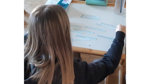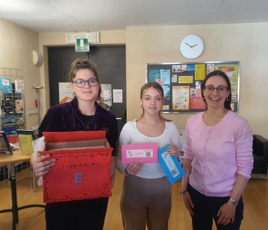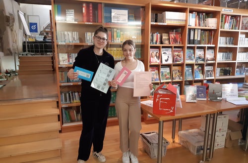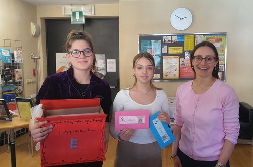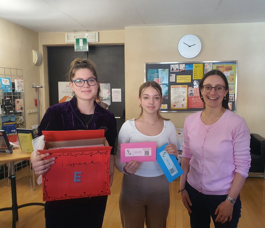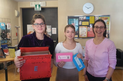 During the recreational education lessons, we made the envelopes ourselves. We folded pink and blue envelopes for the two classes using cardboard we already had at school. This way we were able to save money and, more importantly, it was a conscious sustainable decision not to buy plastic ones. A few students of our class also worked on the logo and on the decoration of the dialogue box. To create the dialogue box, we also thought about a sustainable solution using an old cardboard box of the A4 paper for the printer instead of buying a new one.